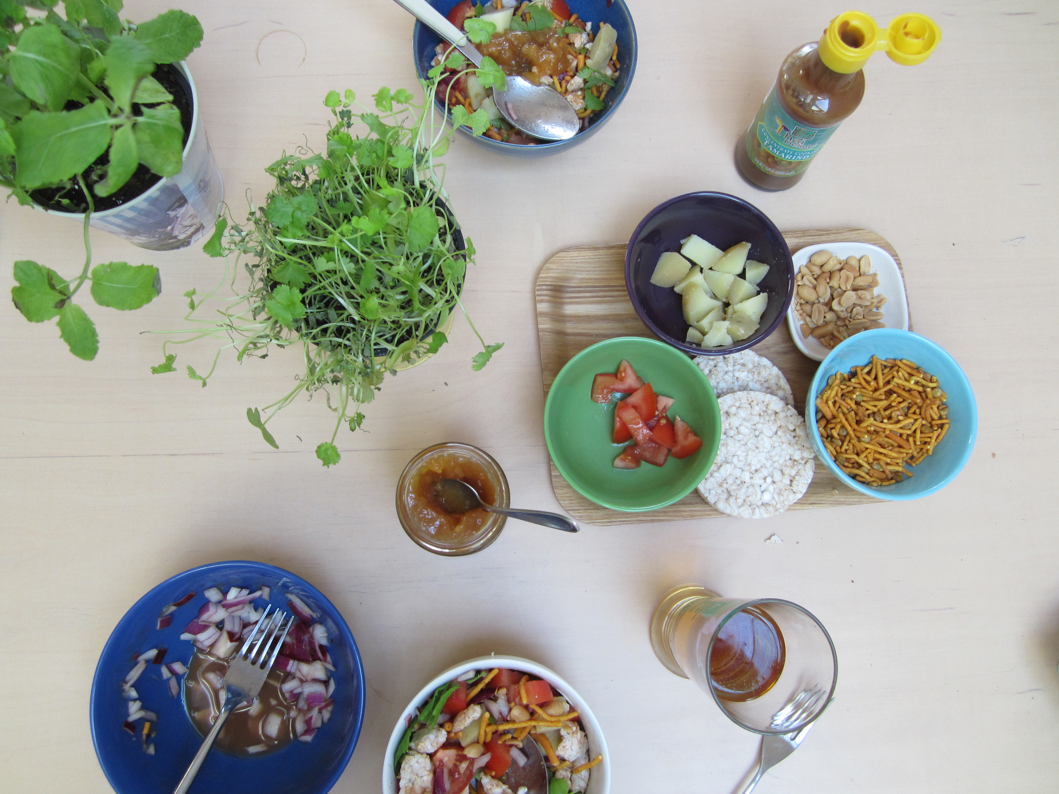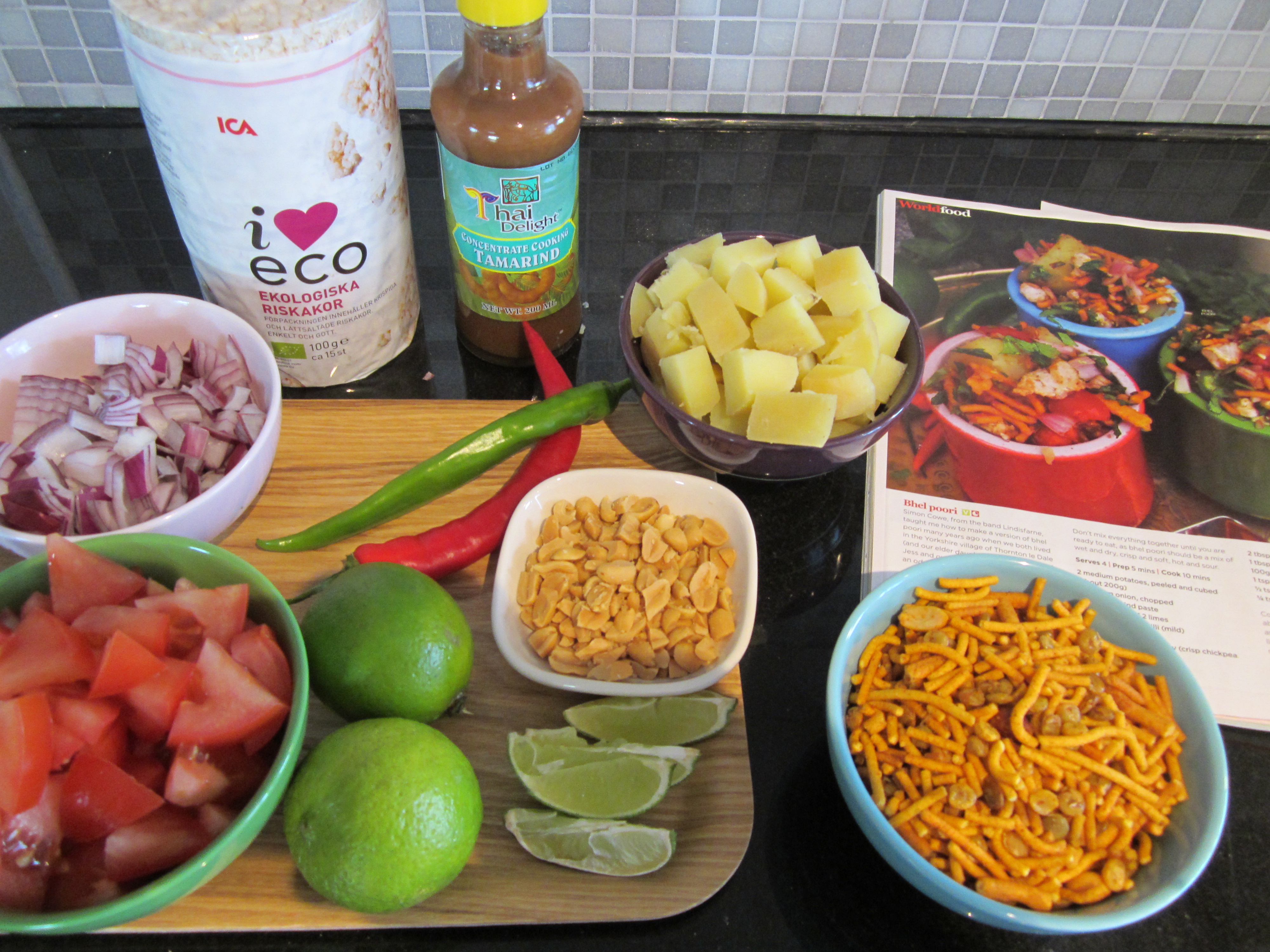 Det er veldig viktig at bhel poori’en ikke lages helt klar på forhånd, men tilberedes rett før servering. Jeg kuttet opp ingrediensene og satte de i små boller på bordet, slik at det bare var å fylle på mer etter hvert.