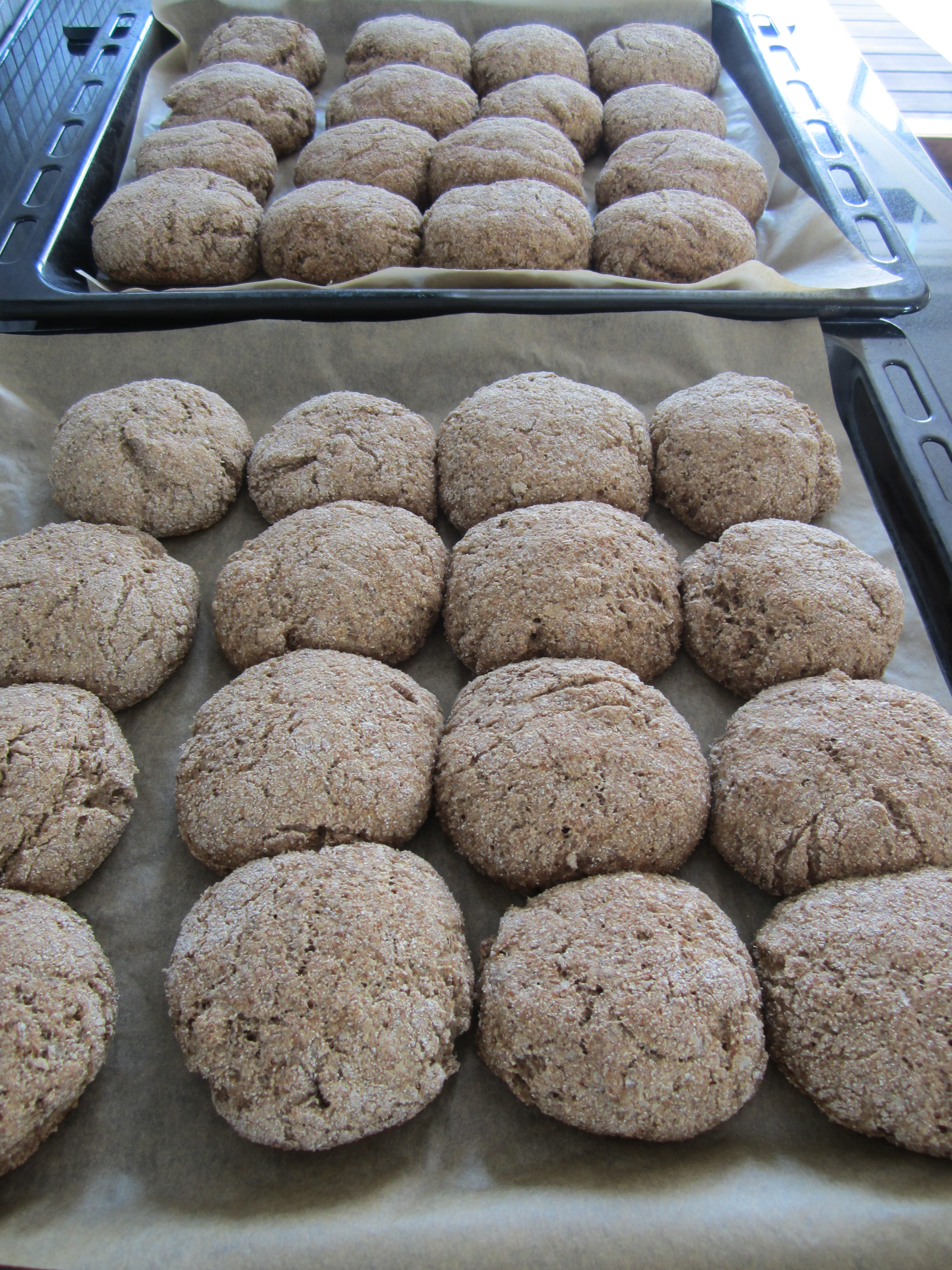 Denne uken var det mel å finne i posen fra Kooperativet. Sånt blir det bakst av! Jeg har fulgt en oppskrift fra Familiens store kokebok (red. Fride Bergem, 1999), i utgangspunktet for 3-4 rugbrød som lages over to dager. Jeg gjorde en liten vri og har i stedet satt to fulle brett med rundstykker for jeg syns det er så praktisk å legge alle i fryseren, og så tine akkurat så mange jeg trenger ved anledning. Ellers er alt ved det samme.