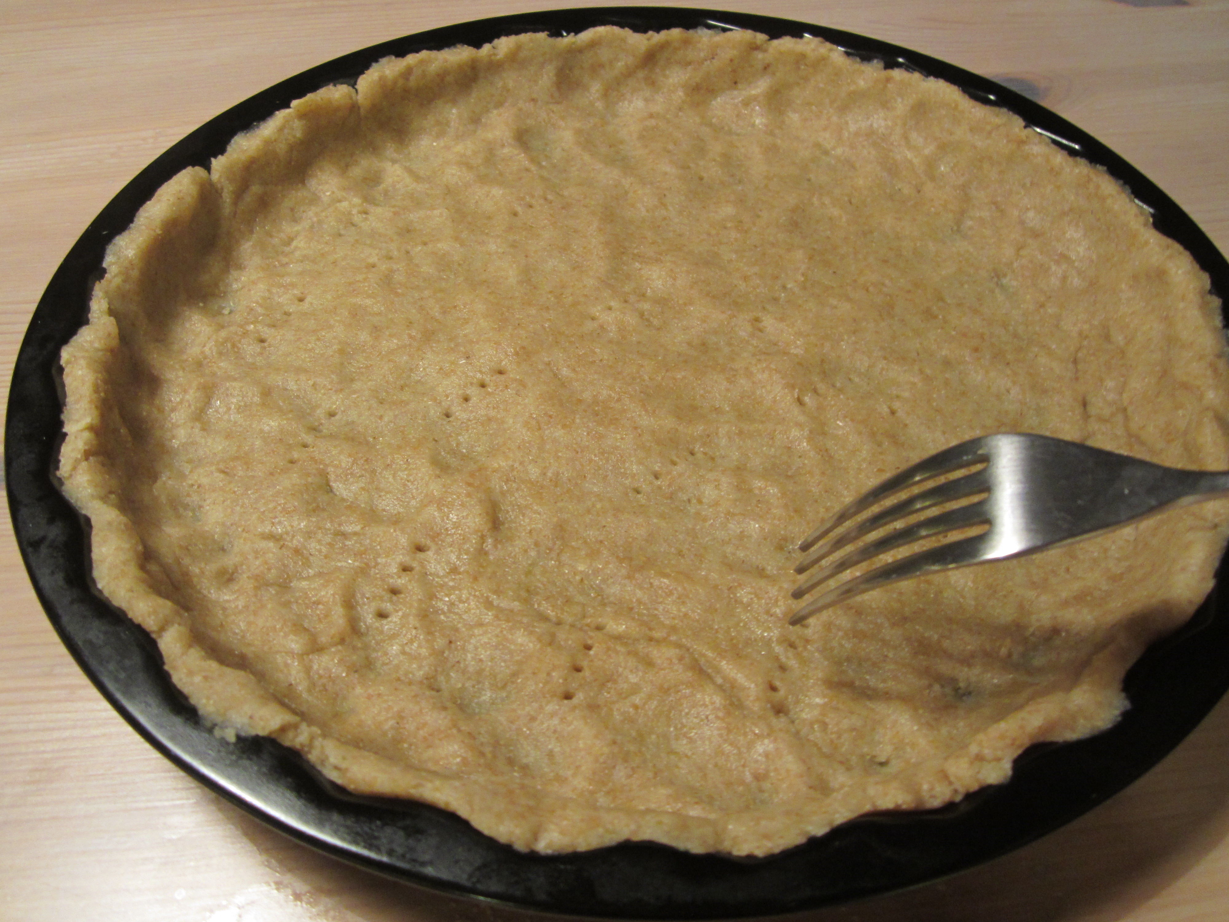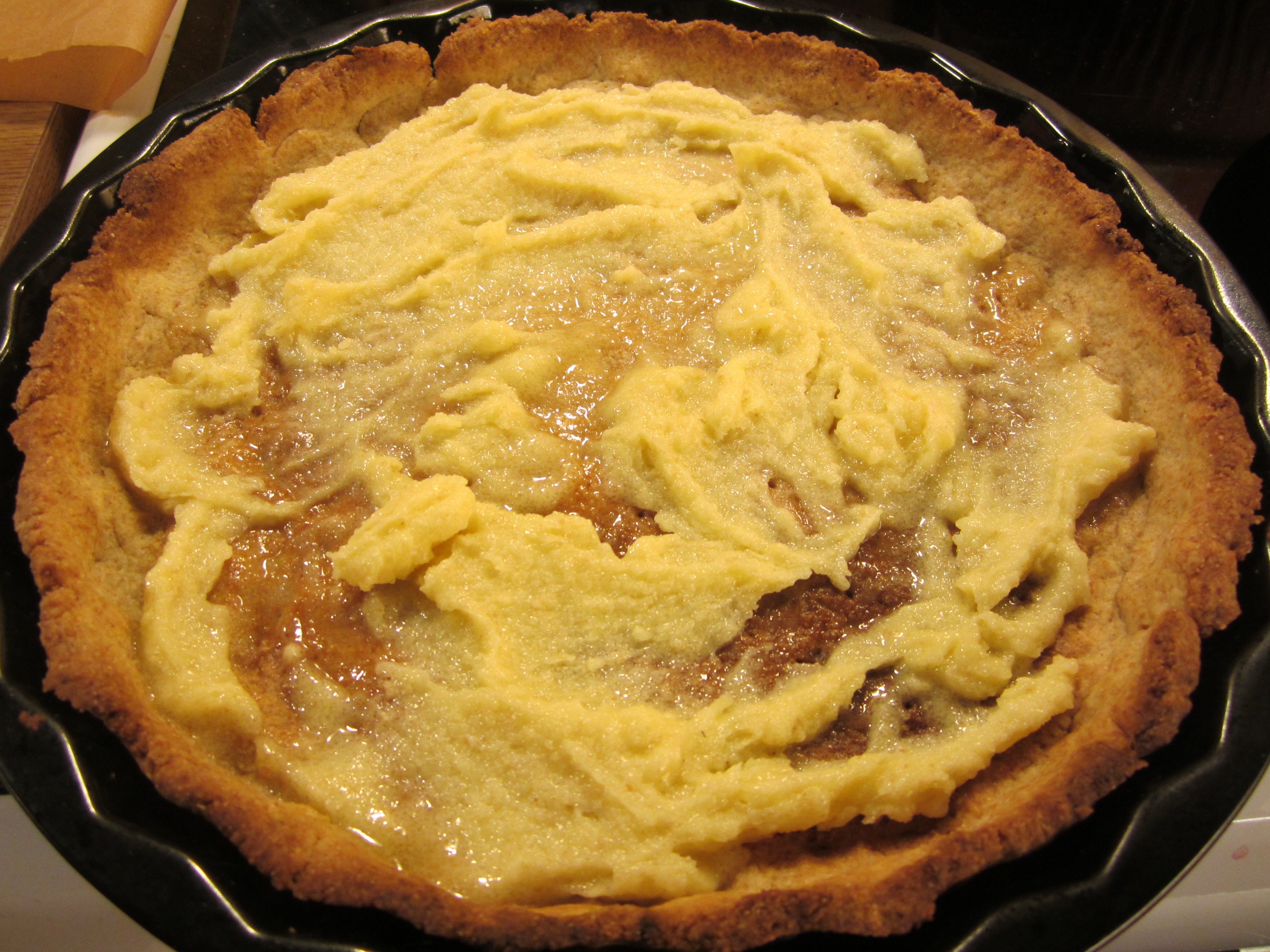 Start med å “smule” sammen mel og salt med margarinen. Tilsett sukker og vaniljeessens, samt nok vann til å få en skikkelig smidig deig. Elt deigen sammen og sett den deretter kjølig i 10 minutter. Kle deretter en paiform med deigen, jeg trykker den lett ut med fingrene til den er jevn og når oppetter kanten på formen. Prikk bunnen lett med en gaffel.
