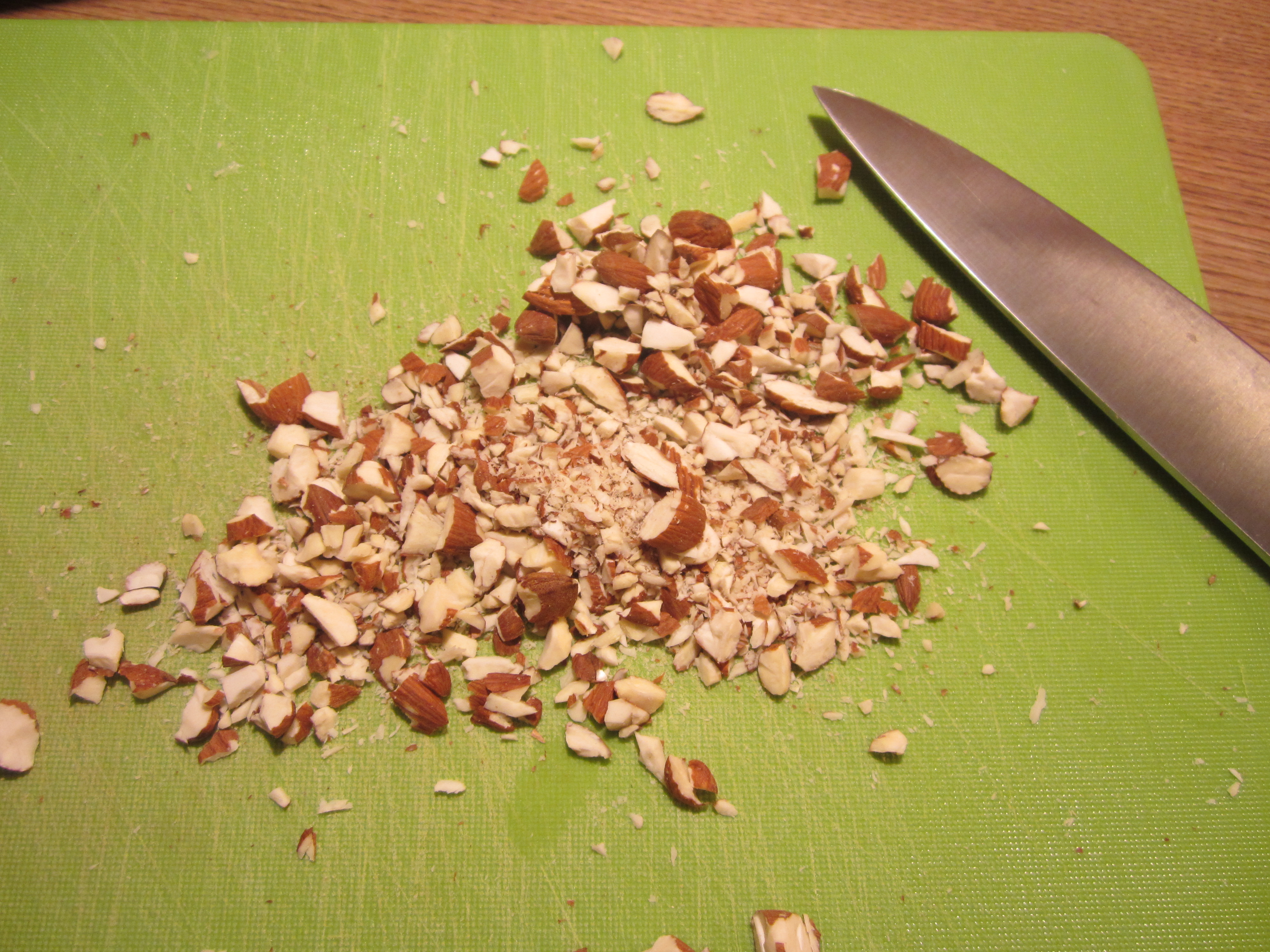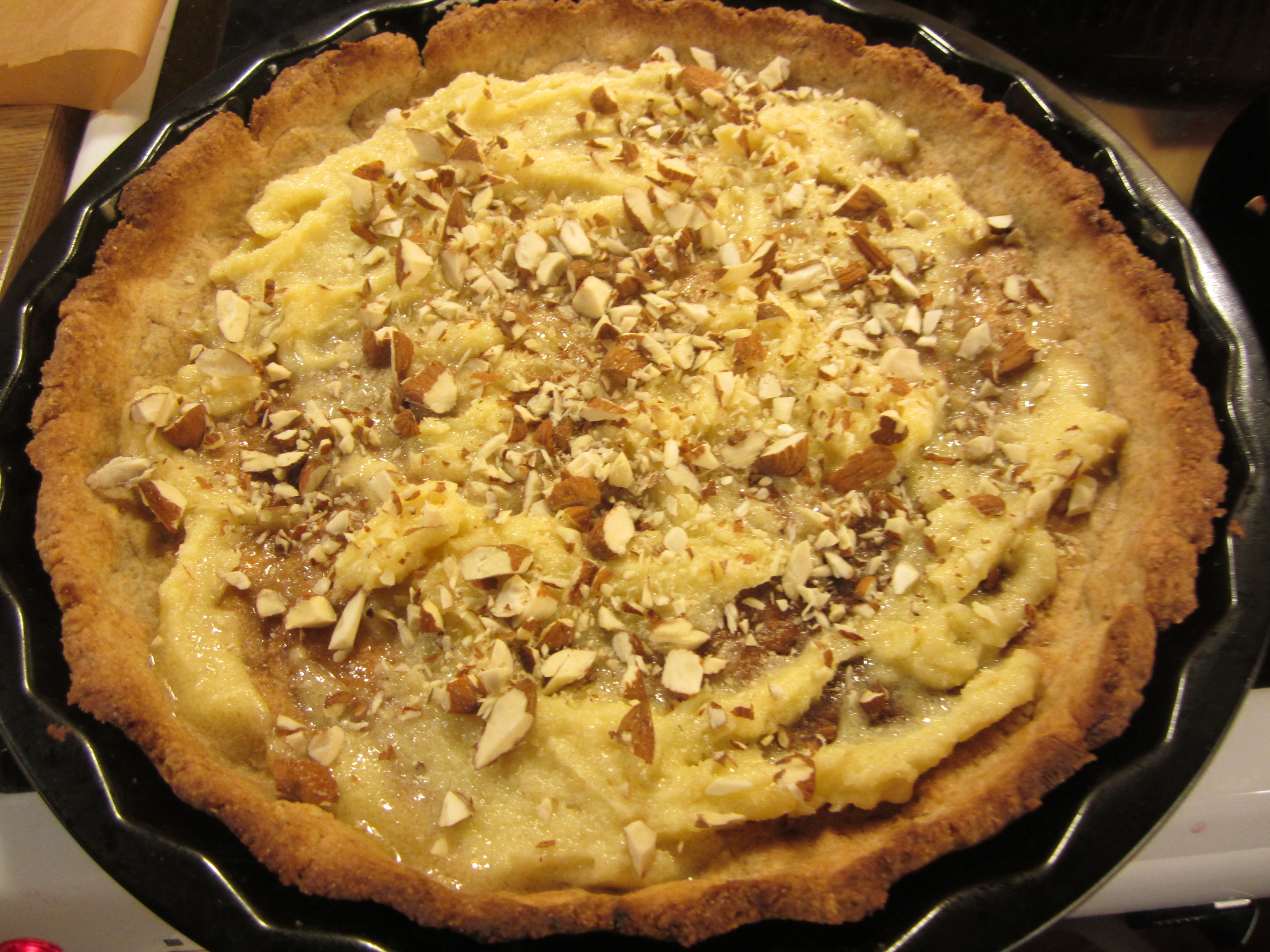Pisk i mellomtiden sammen fyllet. Ha margarin, sukker, mel og vann i en bolle og rør kjapt sammen til en luftig miks. Fordel fyllet i paibunnen og strø over hakkede mandler.