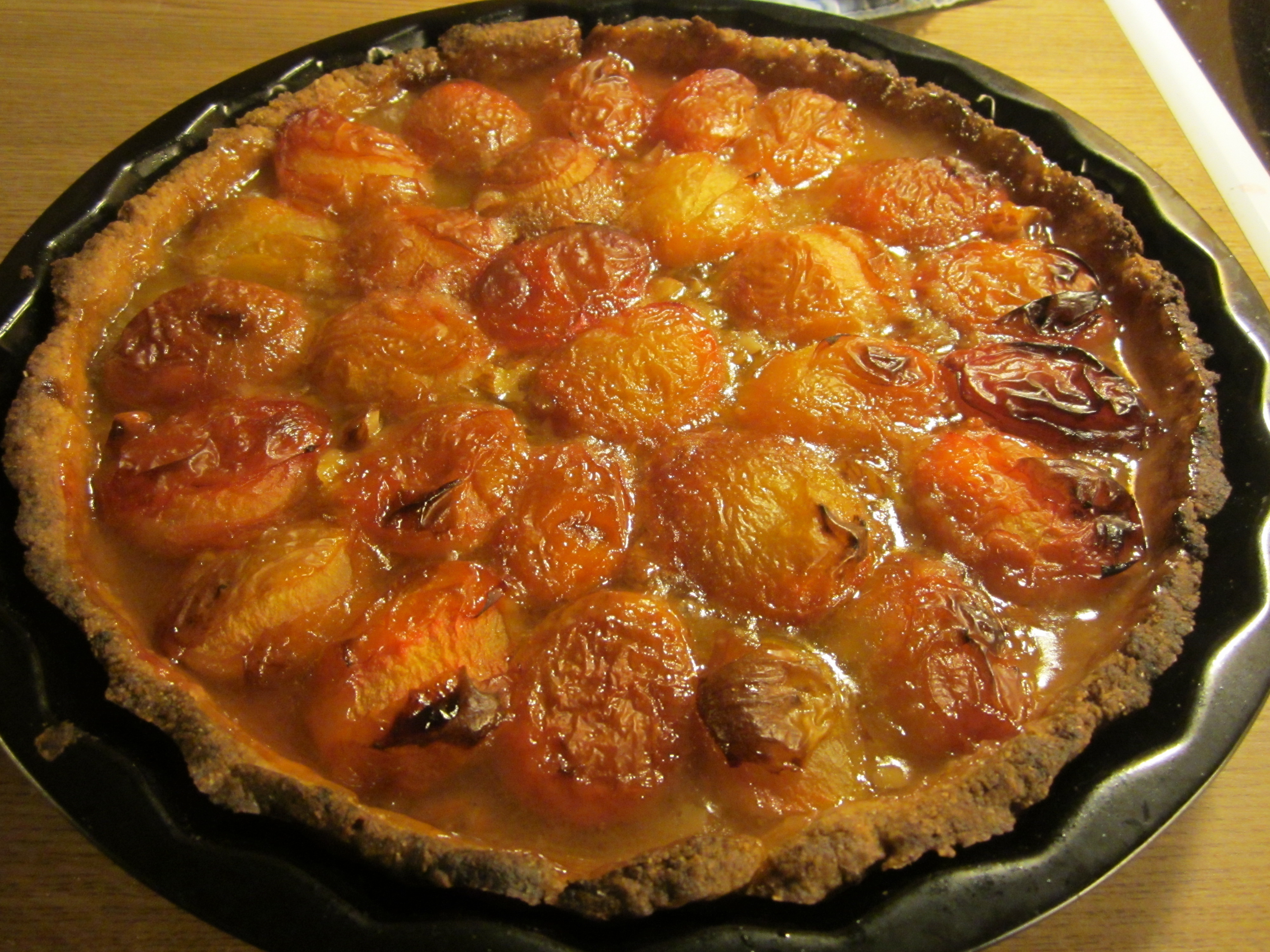 Del hver plomme i to og fjern stenen. Legg frukten i et pent mønster i paibunnen. Glasuren lages ved å koke opp aprikossyltetøyet med vann og deretter sile det gjennom en fin sikt. Hell over paien.