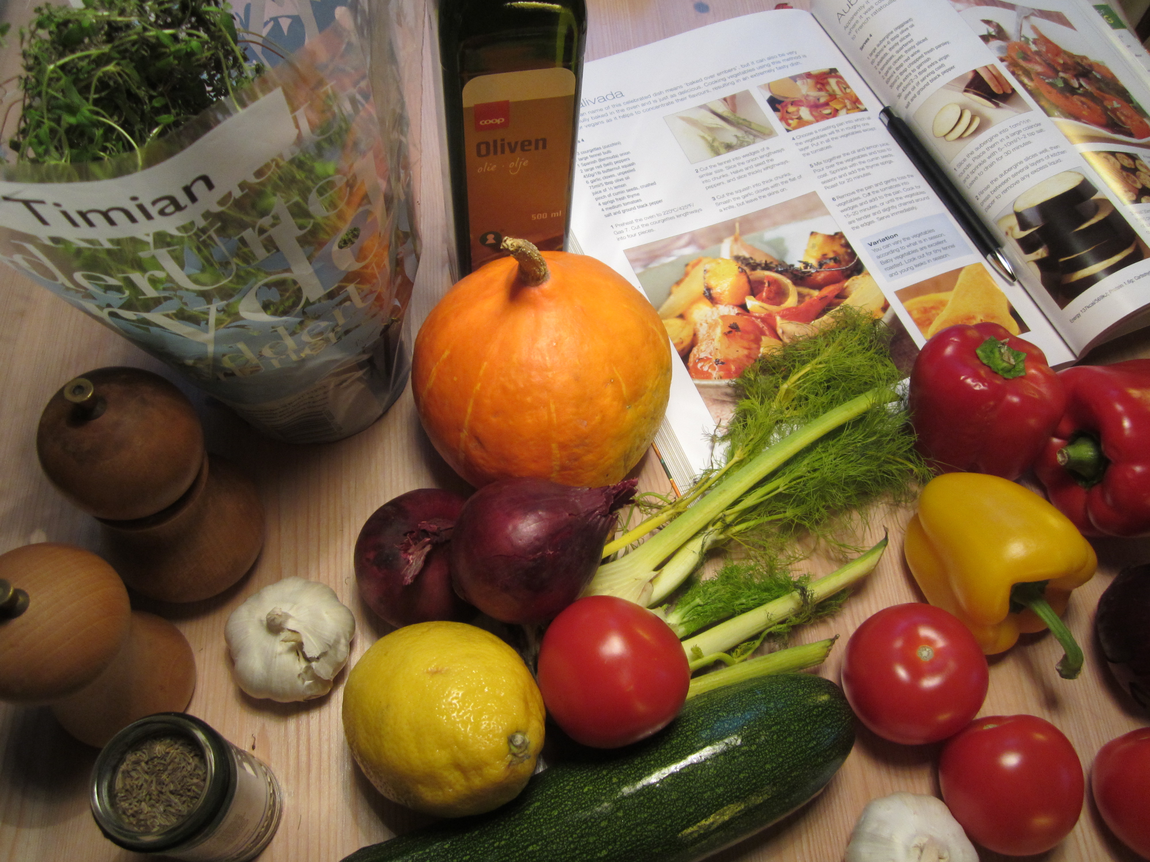 Fortsett med å dele squashen i terninger. Skjær så fennikel og løk på langs og kutt i passe store biter. Kutt paprikaene på langs og del de så et par ganger. Ha alle grønnsakene i en stor ildfast form. Jeg brukte en schlemmertopf som holder godt på de fantastiske aromaene. OBS: Ved bruk av schlemmertopf er det viktig å sette den i vann 15 minutter før bruk.