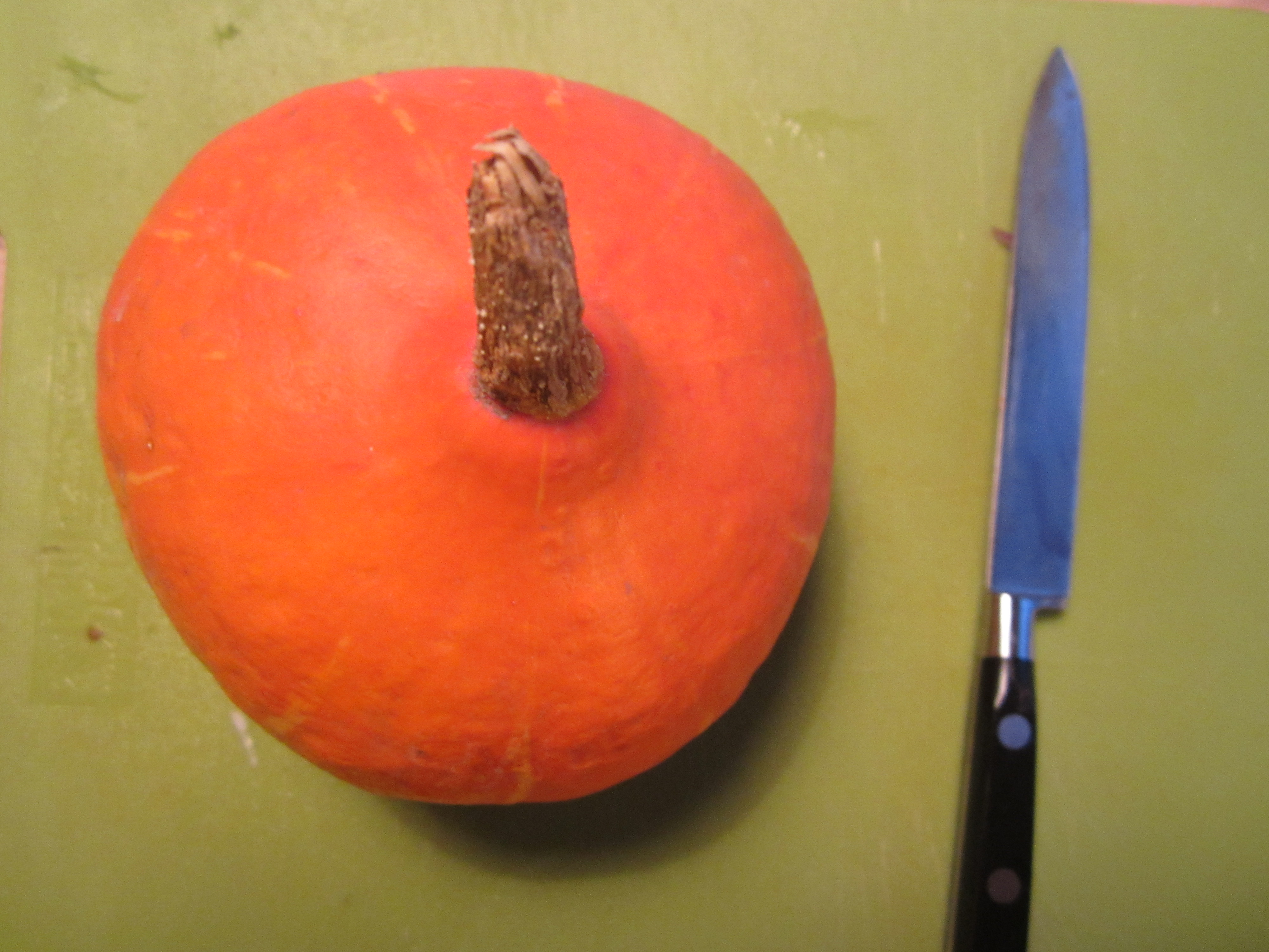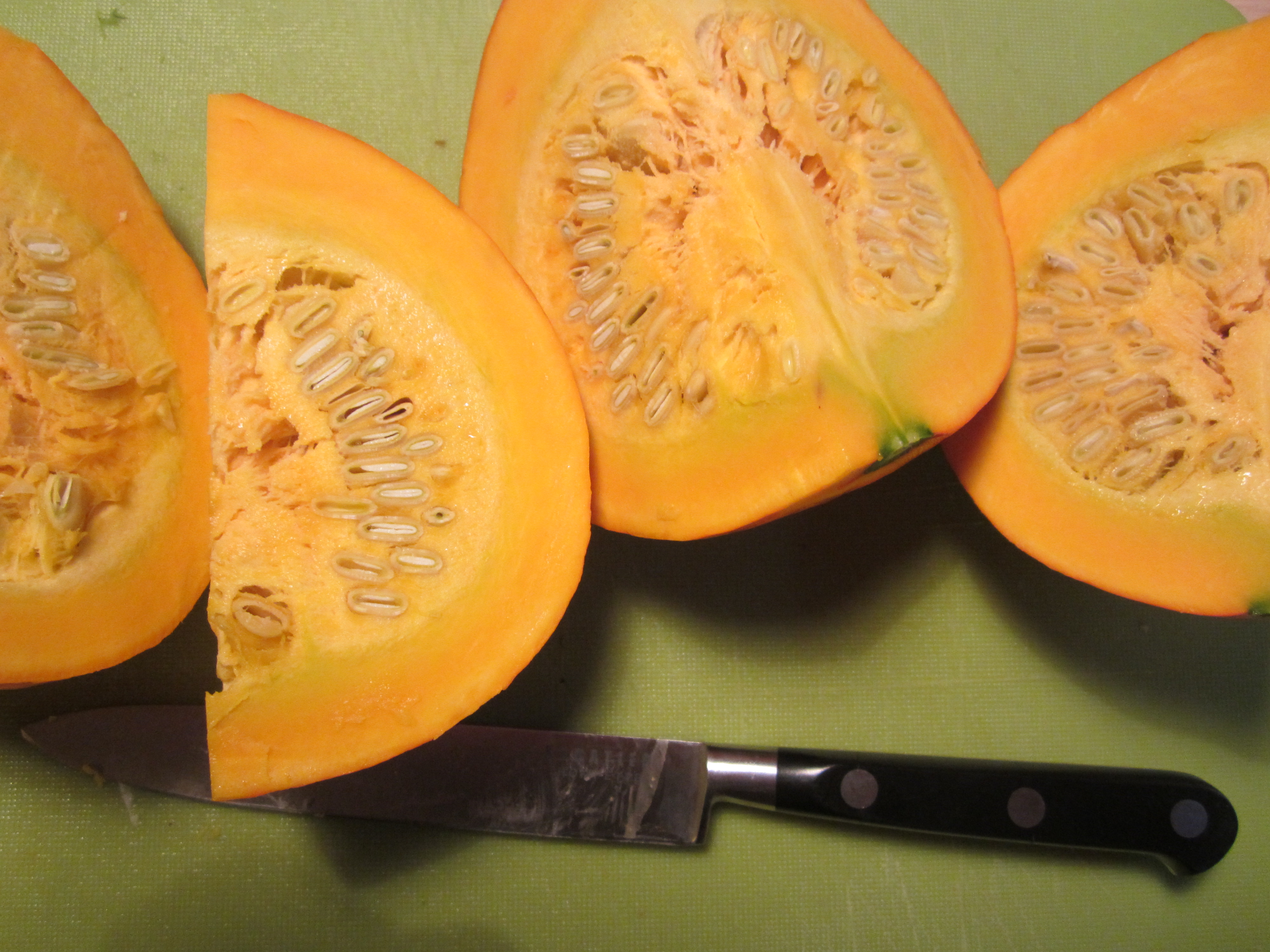 Start med å kutte opp gresskaret, her er en kjapp innføring: Skjær av topp og bunn. Del deretter i fire og grav ut fyllet med en skje. Skrell deretter av skallet med en potetskreller. Del så i passe store biter.