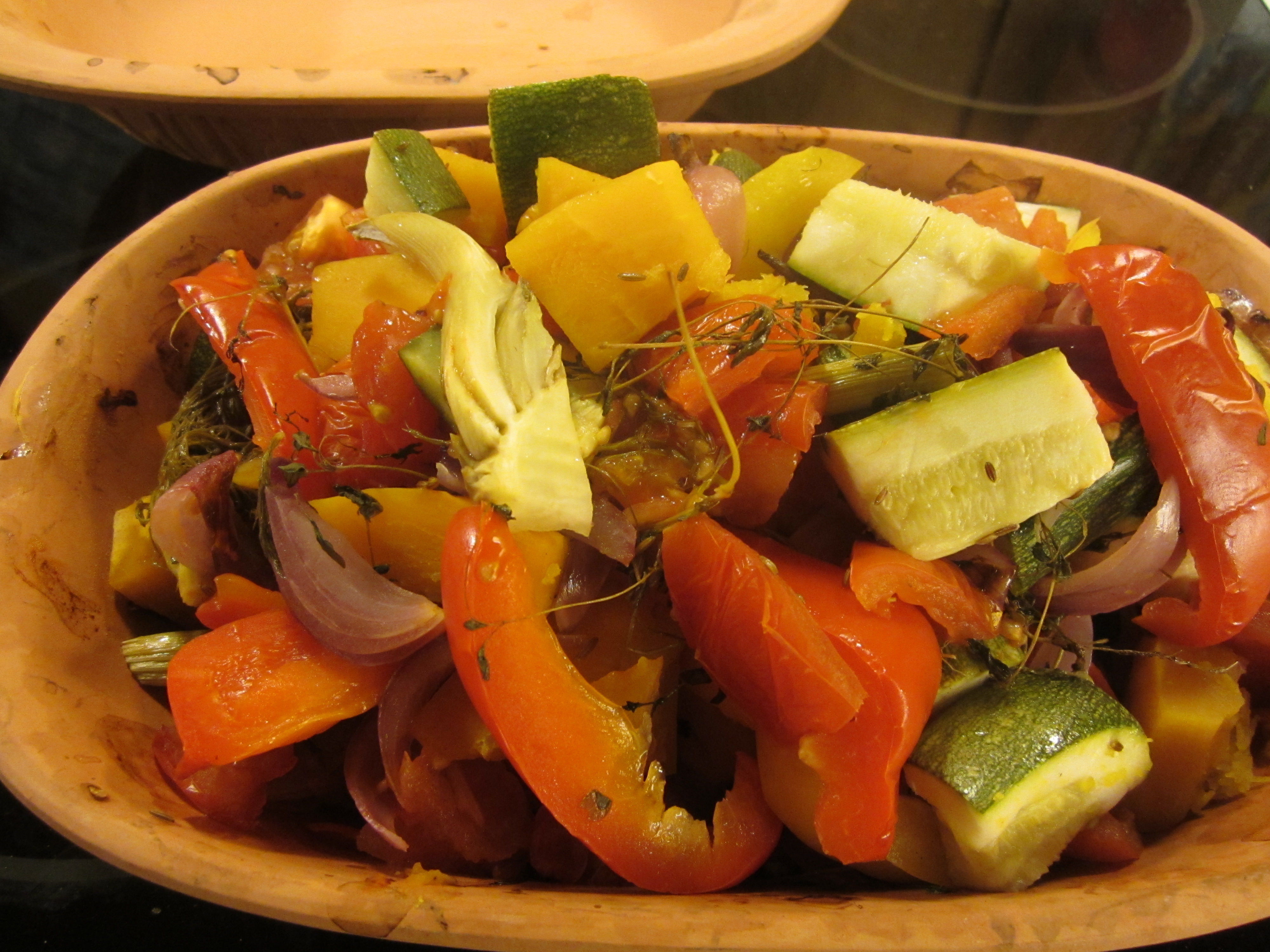 Dette er en tradisjonell catalansk rett der navnet betyr noe sånt som “bakt over glør” men den også tilberedes i vanlig stekeovn for den som ikke har en grue tilgjengelig rundt middagstider. Jeg har i flere oppskrifter sett at det er vanlig å bruke aubergine, men det er det ikke i denne versjonen som jeg er fra The Ultimate Book of Vegan Cooking. Det er i grunnen ikke så viktig nøyaktig hvilke ingredienser retten inneholder, man kan gjerne variere innholdet etter hva som er i sesong.