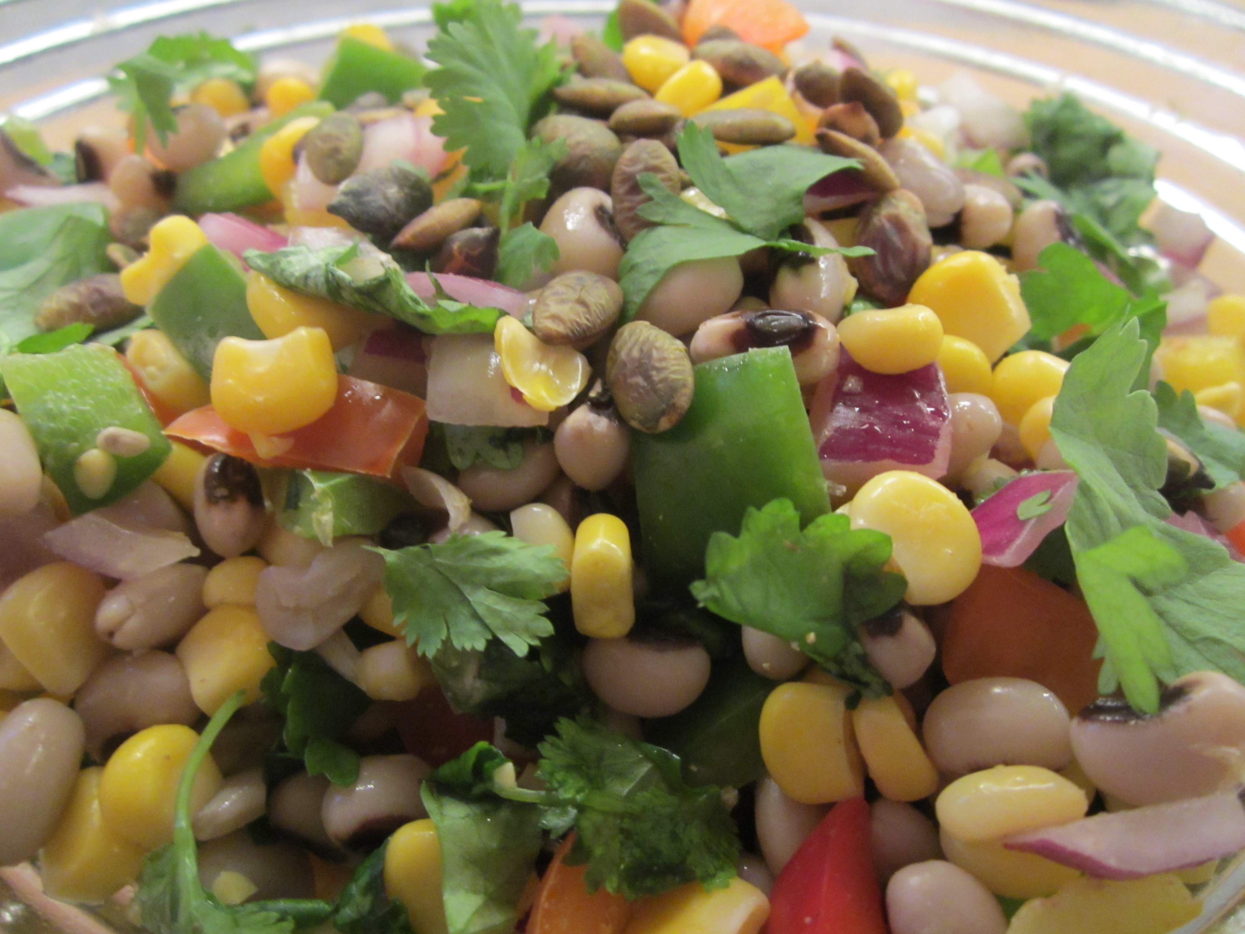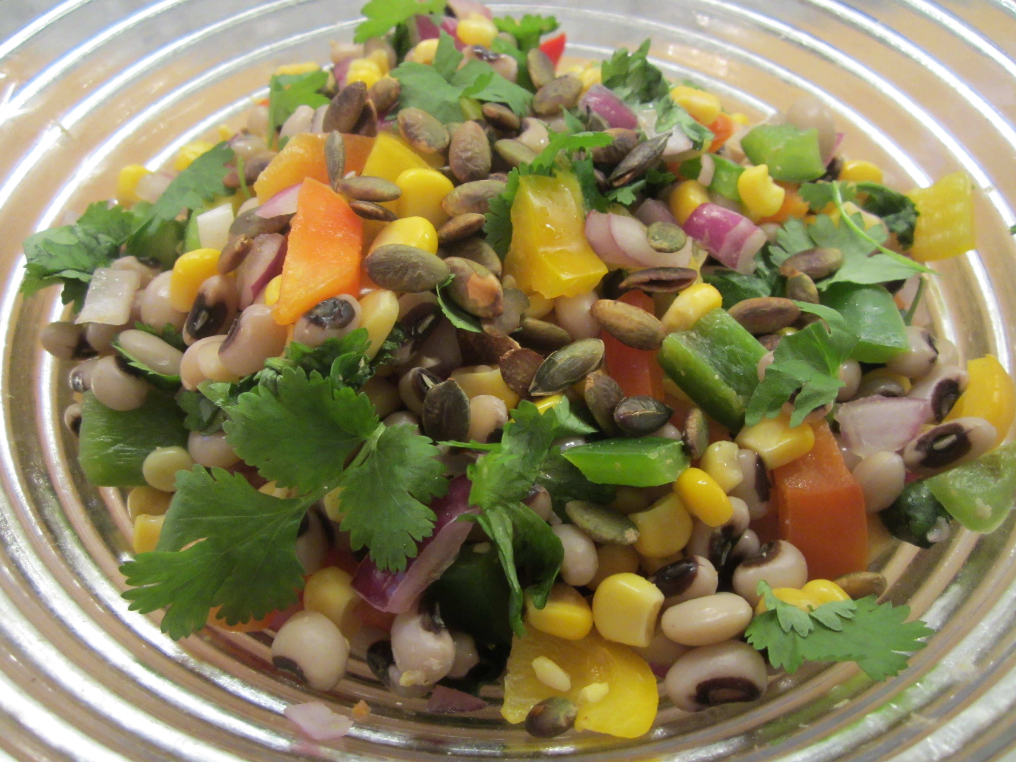Her har jeg laget en latinamerikansk salsa, som både er smakfull, sprø og syrlig for å bruke et godt gammeldags bokstavrim. I oppskriften som kommer fra World Food Café 2 er det brukt sorte bønner, men det hadde jeg tilfeldigvis ikke i hus så da ble det heller svartøyebønner og det syns jeg i grunn fungerte veldig bra det også. Husk på å legge bønnene i vann dagen i forveien for kortere koketid, eller kjøp de ferdig på boks om du vil.