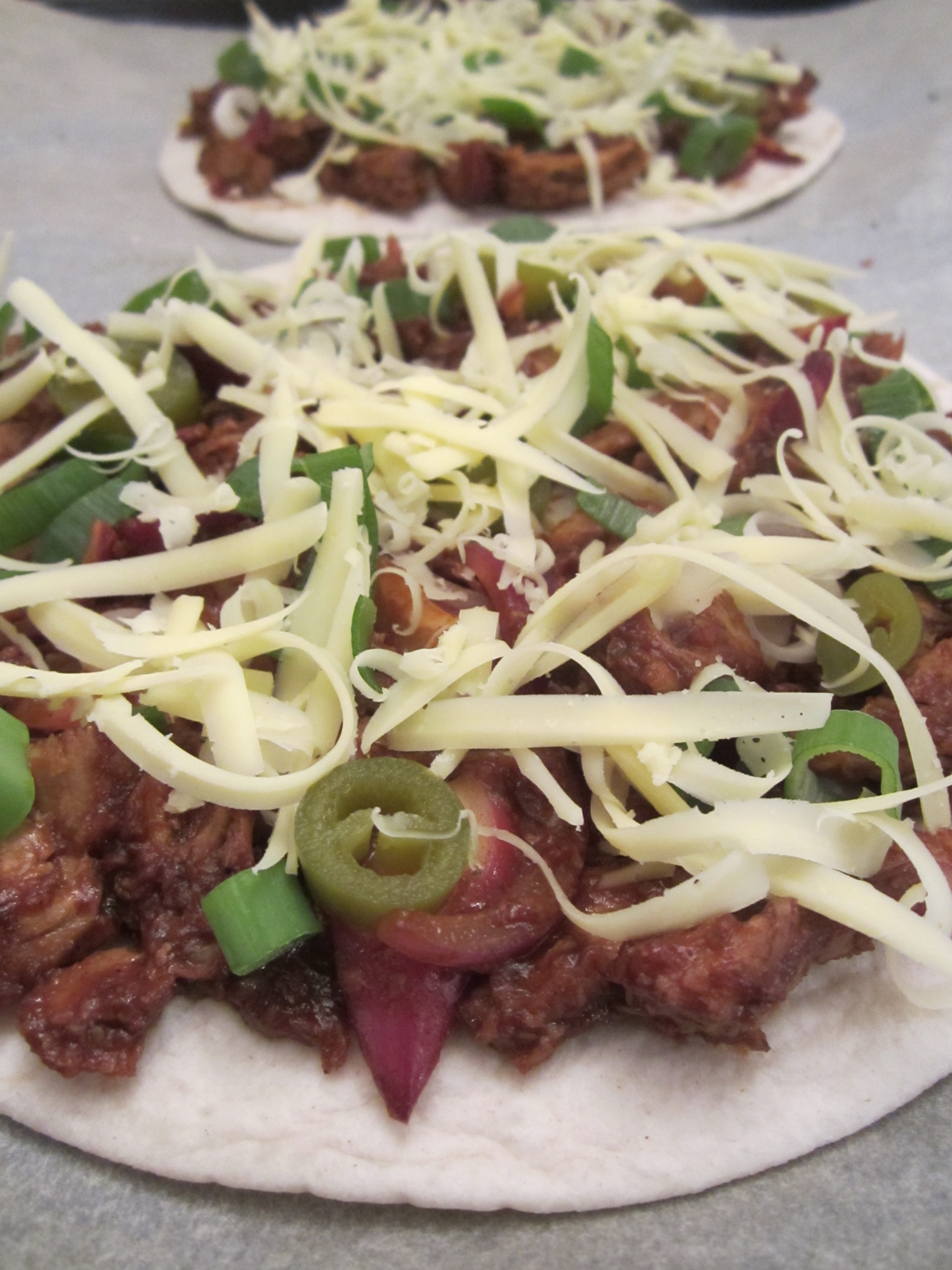 Oumph!’en trenger ikke kraftig varmebehandling, jeg varmet den ganske hurtig i en liten stekepanne sammen med skivet rødløk. Oumph’en er faktisk krydret fra før av, men jeg brukte en dæsj Jerk BBQ-saus i tillegg. Så er det bare å bre fyllet over en pizza tortilla, og strø over litt oppkuttet vårløk og noen skiver jalapeno på glass (disse var dessverre ikke tilstede da bildet ble tatt). Til slutt toppet jeg med revet veganost fra Astrid og Aporna kjøpt i Strømstad, rett over svenskegrensen. Stekes kjapt i varm ovn.