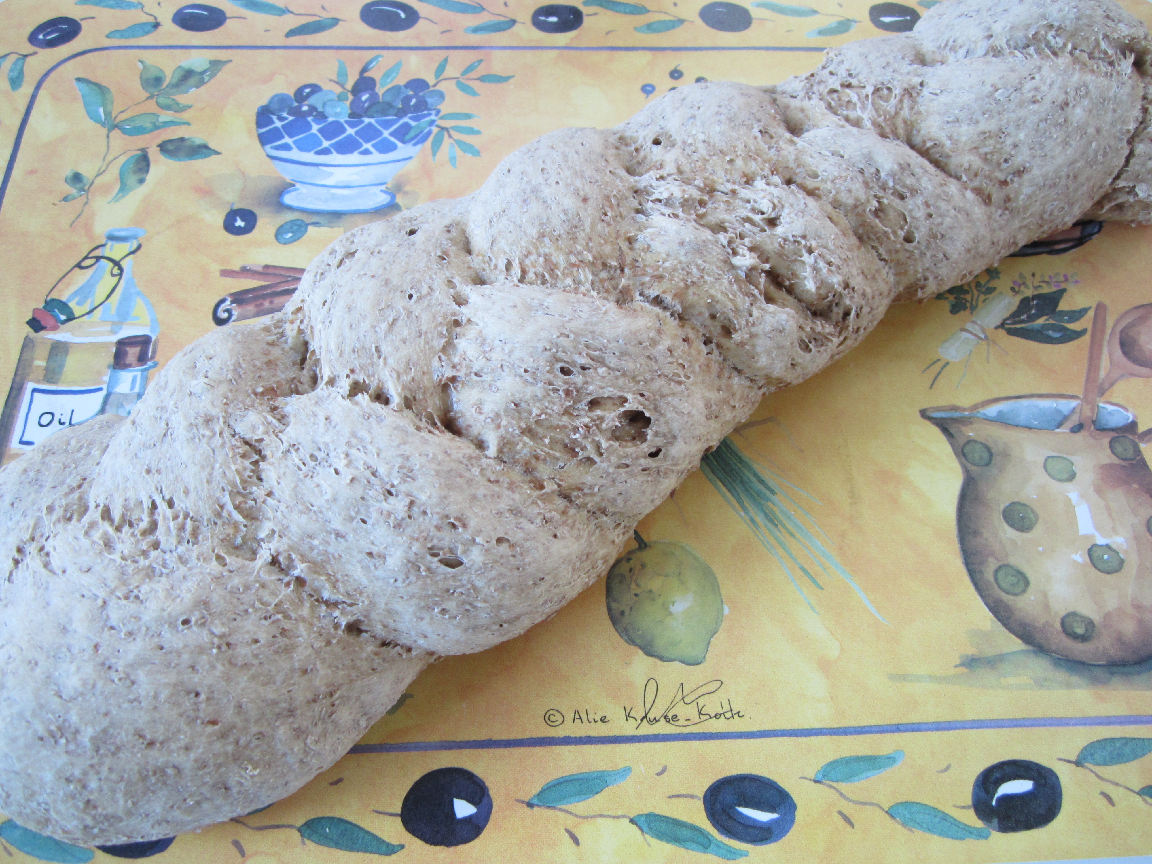 Del deigen i to emner. Del deretter hver av disse i tre og rull ut til lange pølser. Legg tre pølser ved siden av hverandre og flett de sammen annen hver gang fra høyre og venstre. Resultatet er to passe store fletter som legger på kledt bakebrett. Jeg etterhevet loffen en halvtimes tid og da forsvant litt av flettemønsteret. Det betyr at jeg kanskje øve på å gjøre mønsteret mer markant. Godt ble det uansett, og det er jo tross alt det viktigste når det kommer til mat.
