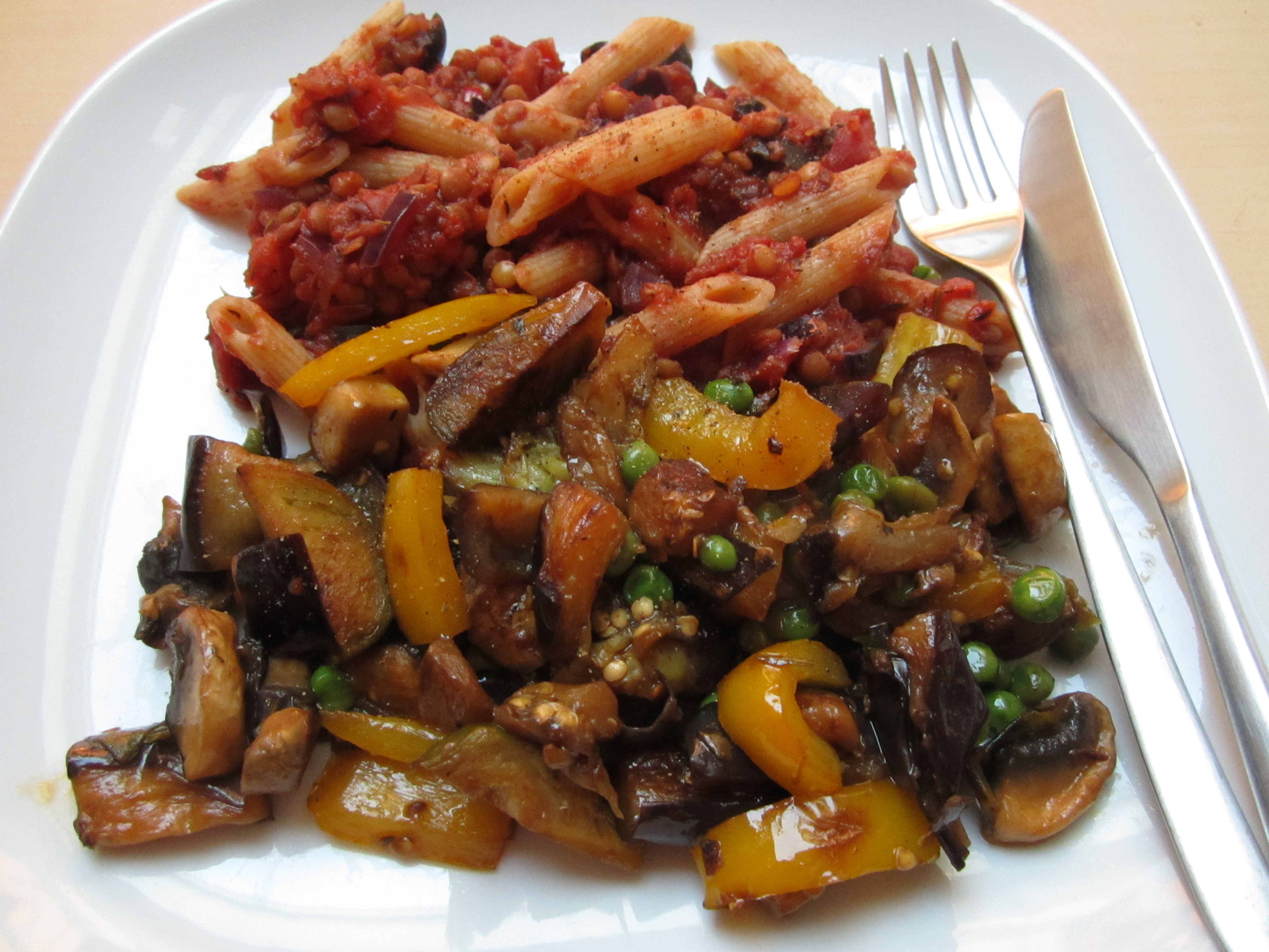 I løpet av den tiden det tar å steke hasselnøtter og lage pastasaus er det kjempefint om man klarer og koke opp vann og tilberede pasta. Så er det bare å ha alt over på en tallerken og krysse fingrene for at man får tid og anledning til å spise den. Heldigvis smaker maten godt selv om den rekker og bli kald i mellomtiden.