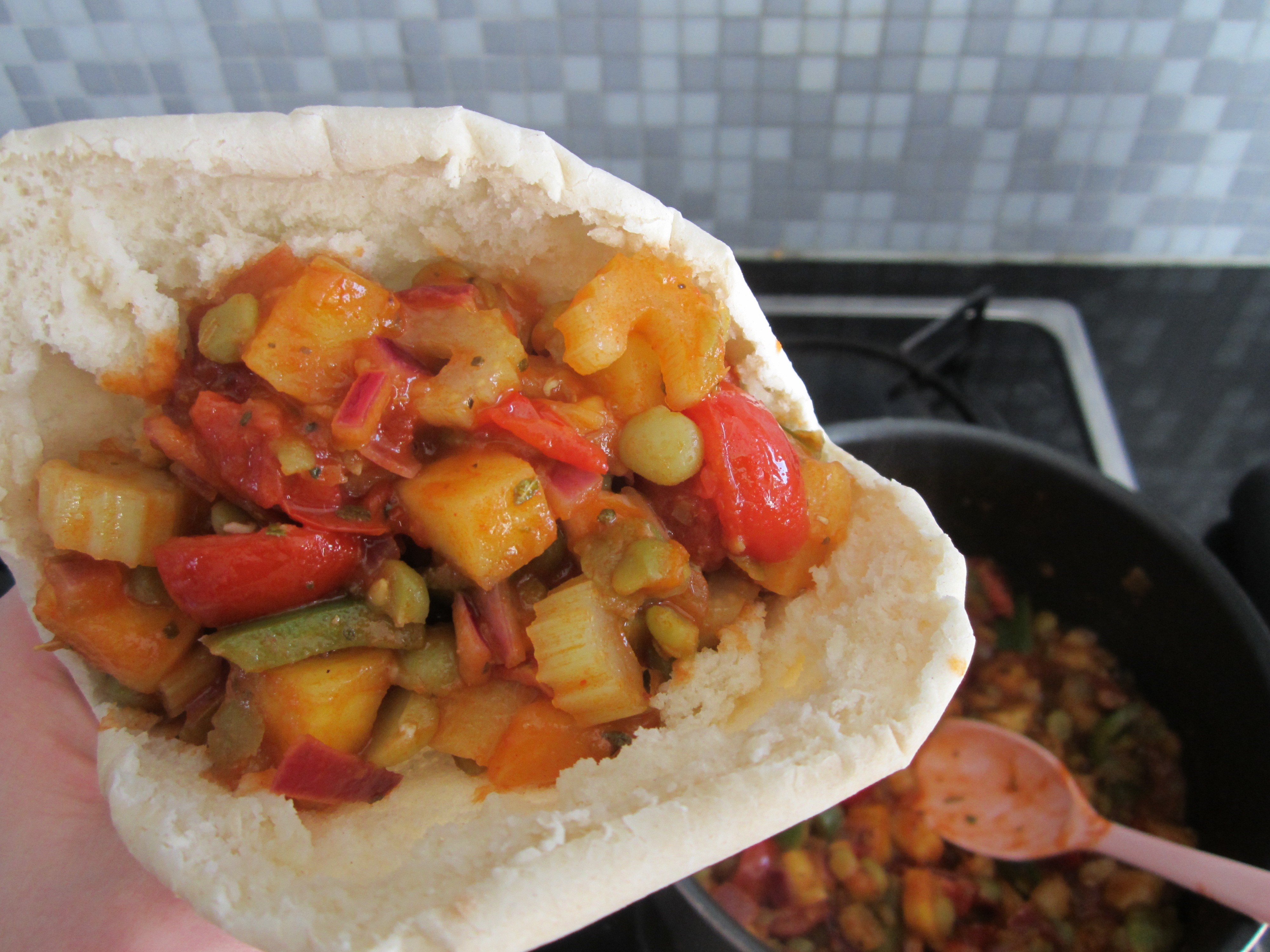 Av grønnsaker brukte jeg frosne erter og babygulrøtter, og en boks hermetisk sjampinjong. Sjampinjong på boks har en helt annen konsistens enn vanlig sopp, men jeg syns det gjør seg i denne oppskriften. Det minner litt om sjømat som blåskjell eller reker ved at det er litt svampete, i mangel av bedre ord.