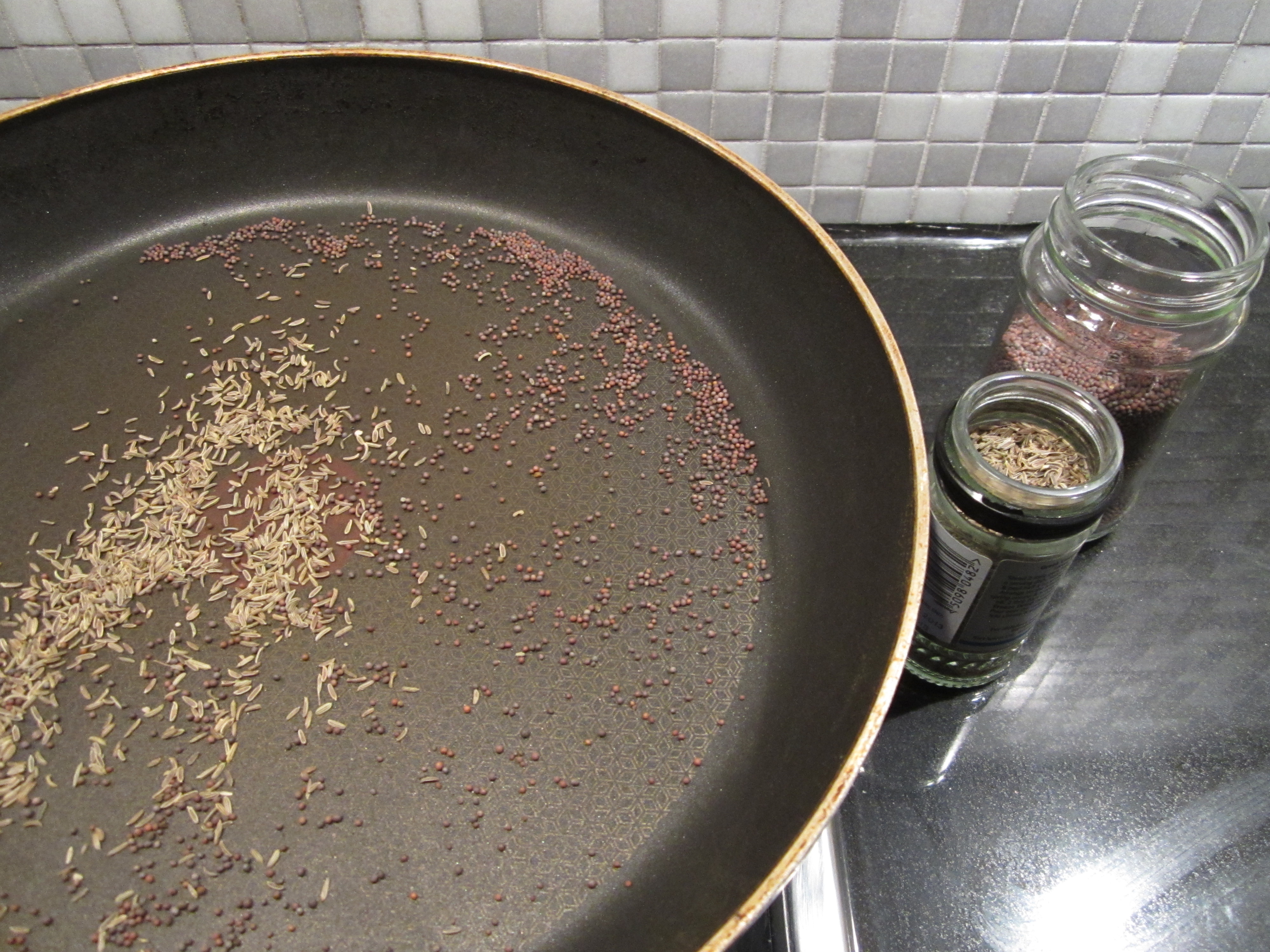 Start med å riste senneps- og spisskummenfrø i en tørr panne i et halvt til ett minutt. De skal “poppe” lett. Bland så inn tandoorikrydder, riv fersk ingefær og bland inn oljen. Skjær løken i halvmåneskiver og fres i pannen til de blir lett gylne.