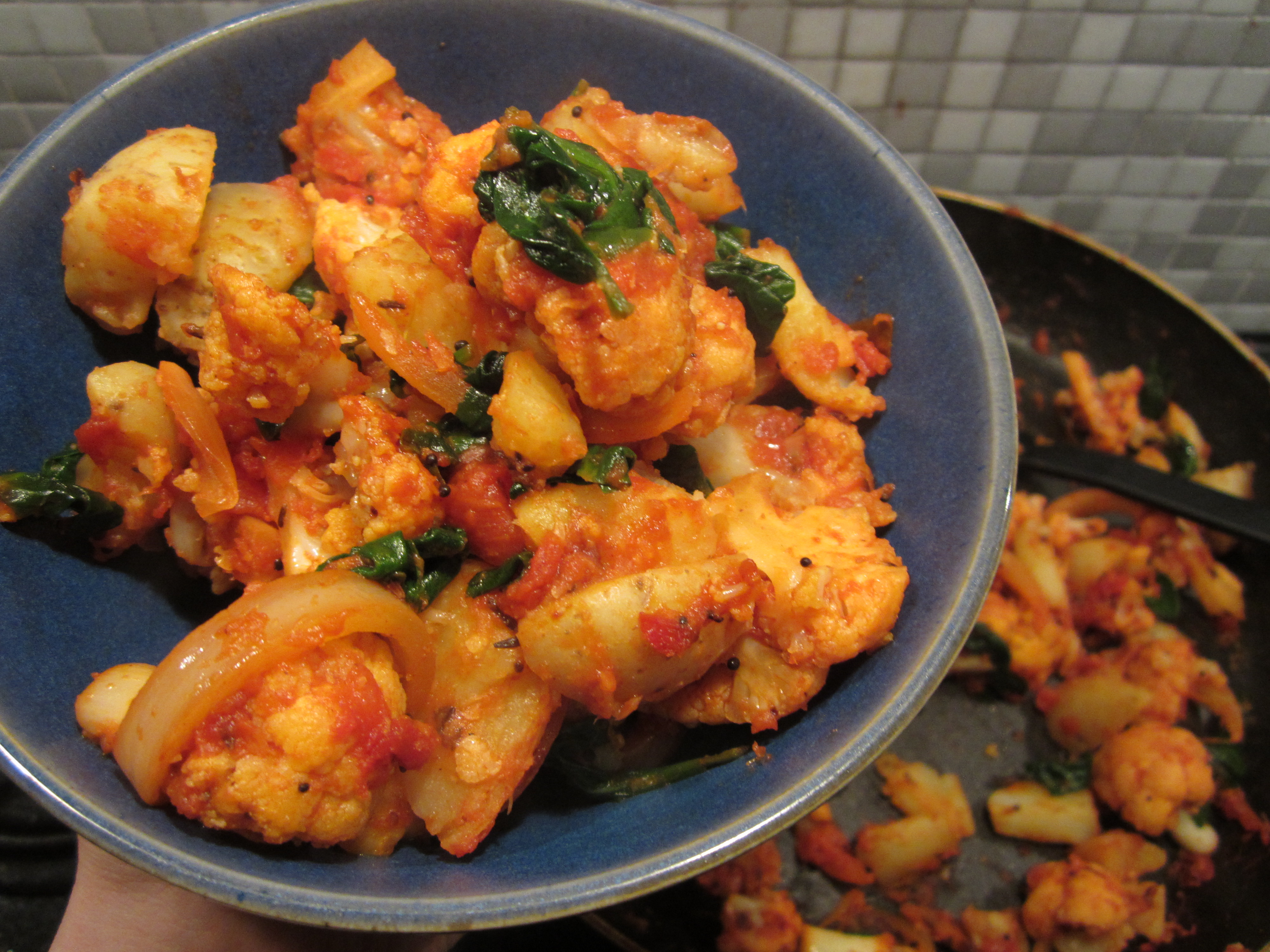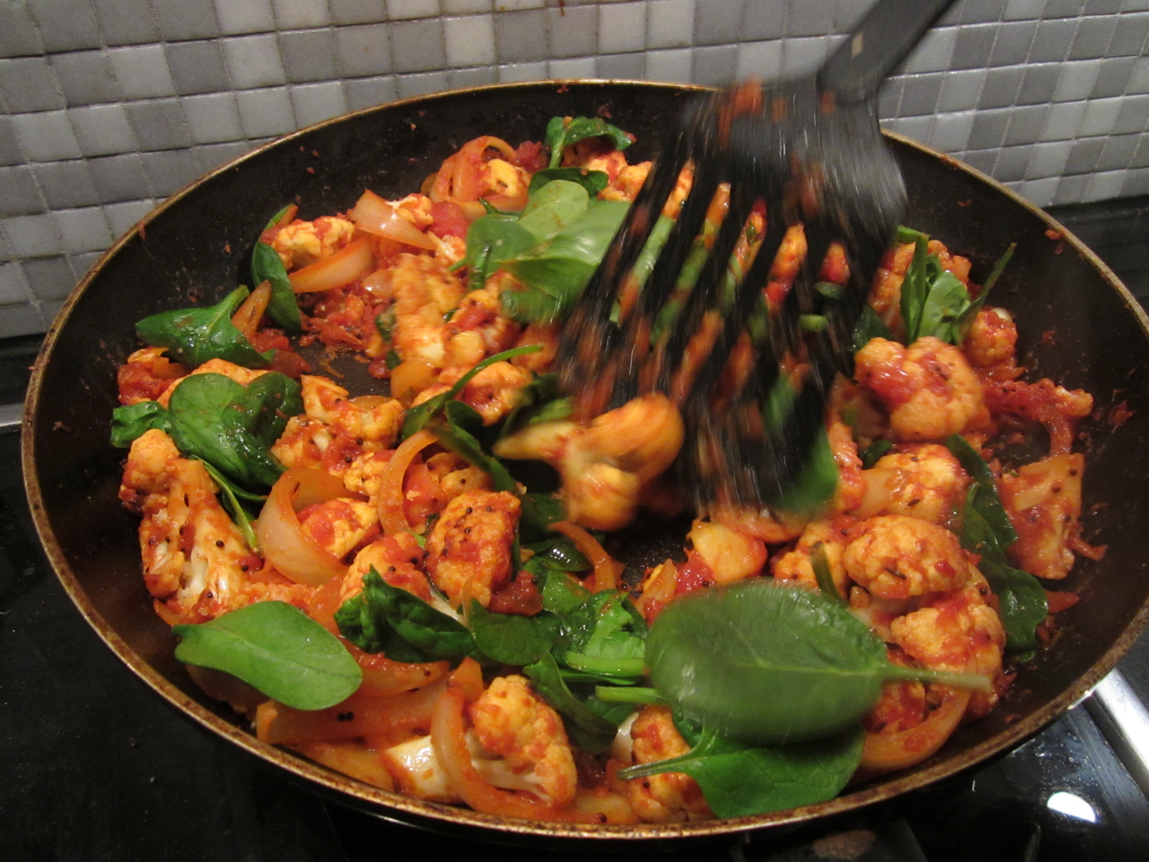 Hell så over en boks hakket tomat og gi et oppkok. Skjær blomkålhodet i små buketter, ha i pannen og la de putre i ti minutter. Tilsett bittelitt vann dersom det tørker ut. Rør så inn spinaten litt etter litt, slik at den rekker å falle sammen noe. Ha i potetene og la curryen putre ytterligere noen minutter til alt er gjennomvarmt. Ikke overstek mer enn nødvendig, jeg foretrekker i alle fall at blomkålen fremdeles er nokså crispy!