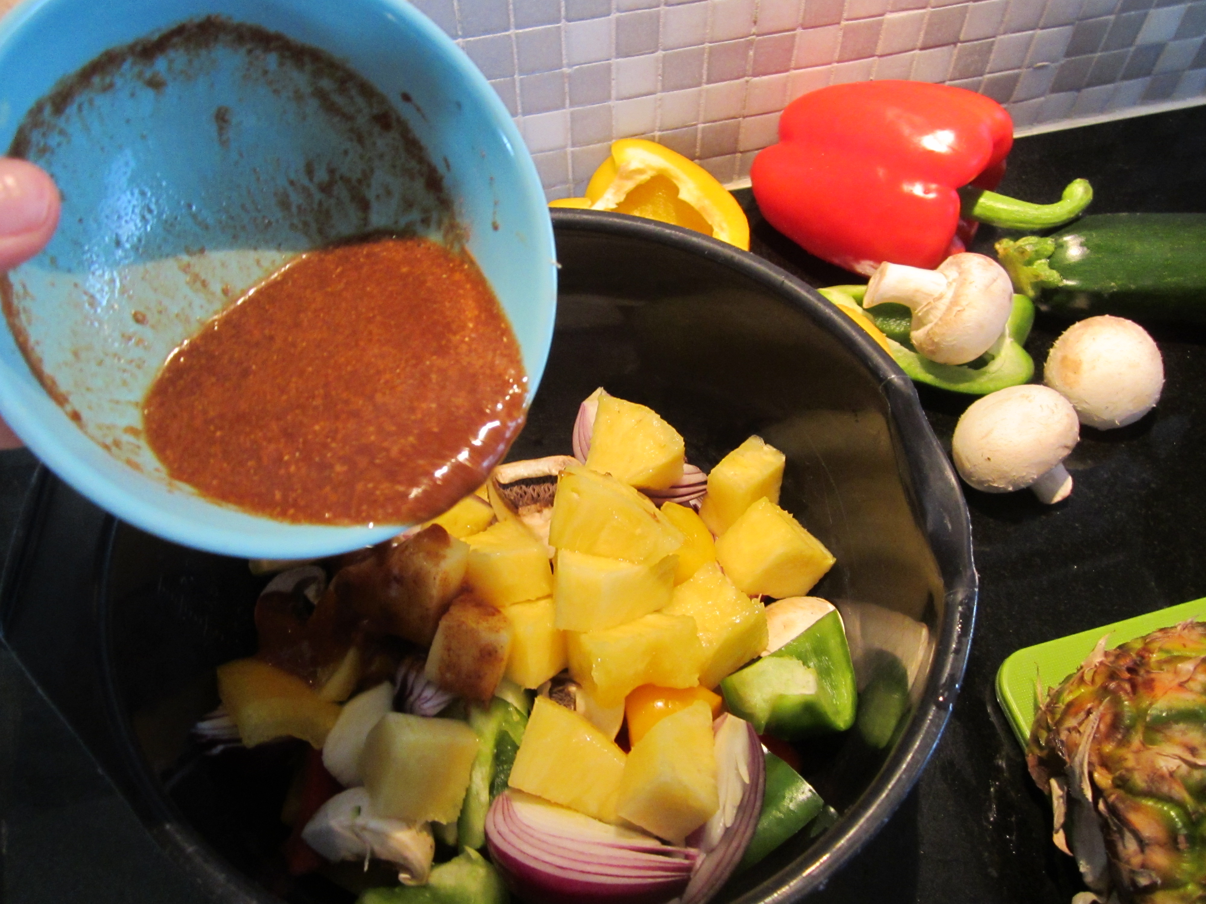 Bønner og resten av grønnsakene har jeg over i bollen med dressing. Cherrytomatene delte jeg i fire. Paprika og rødløk finhakkes. I oppskriften ble det brukt grønn og gul paprika, men det var grønn og oransje jeg hadde i kjøleskapet, så da ble det slik. Dette er typisk en oppskift hvor jeg syns det er greit å variere ingrediensene ettersom hva man har, eller hva man har lyst på. En del Texas caviar oppskrifter bruker heller ikke mais, men jeg syns det passet finfint. Dryss gjerne over noe av den friske korianderen.
