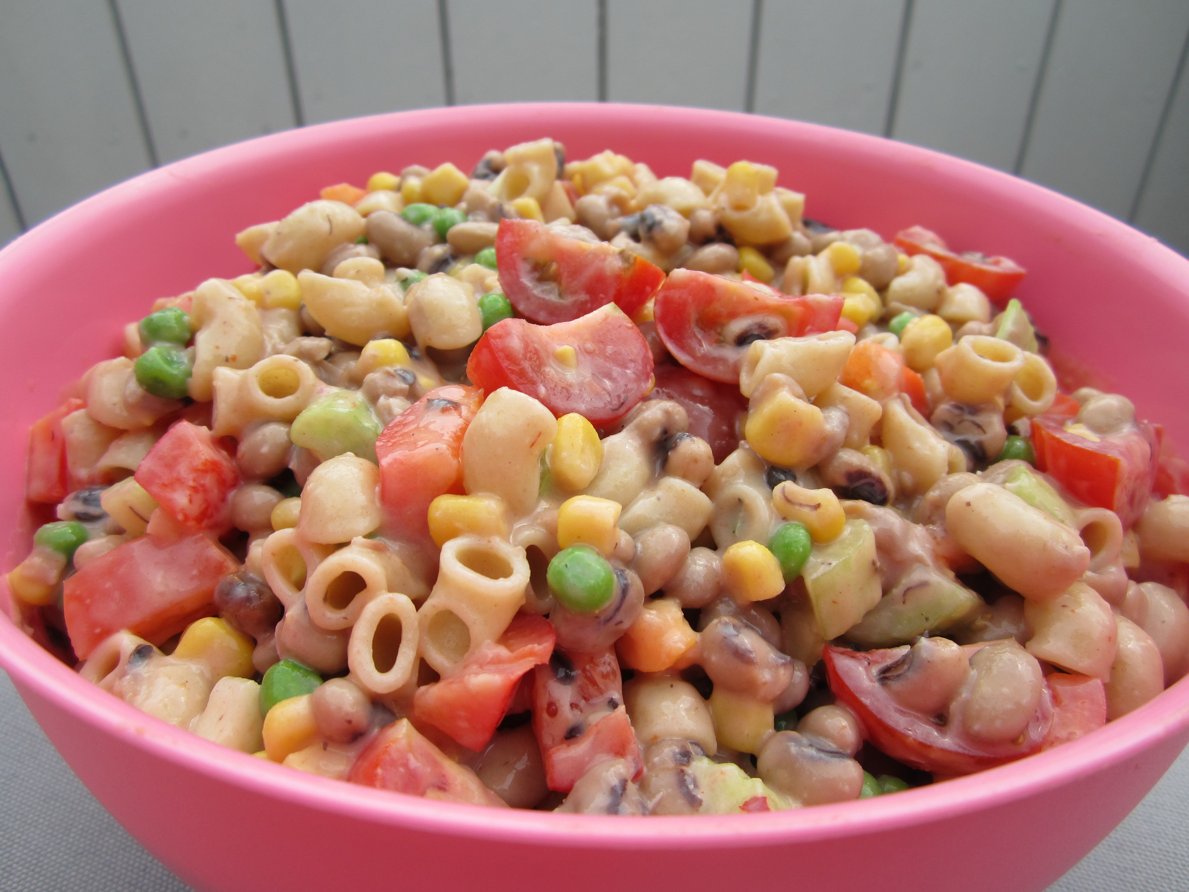 Jeg koker gjerne bønner i store kvanta i presskoker og fryser det så i mindre bokser. I denne retten vil jeg anta at det gikk med noen hundre gram ferdige bønner. Svartøyebønner, eller black eyed peas har jeg knapt sett ferdig til bruk på butikken. Man kan vel til nød bytte de ut med sorte bønner, selv om det vil gi en helt annen smak.