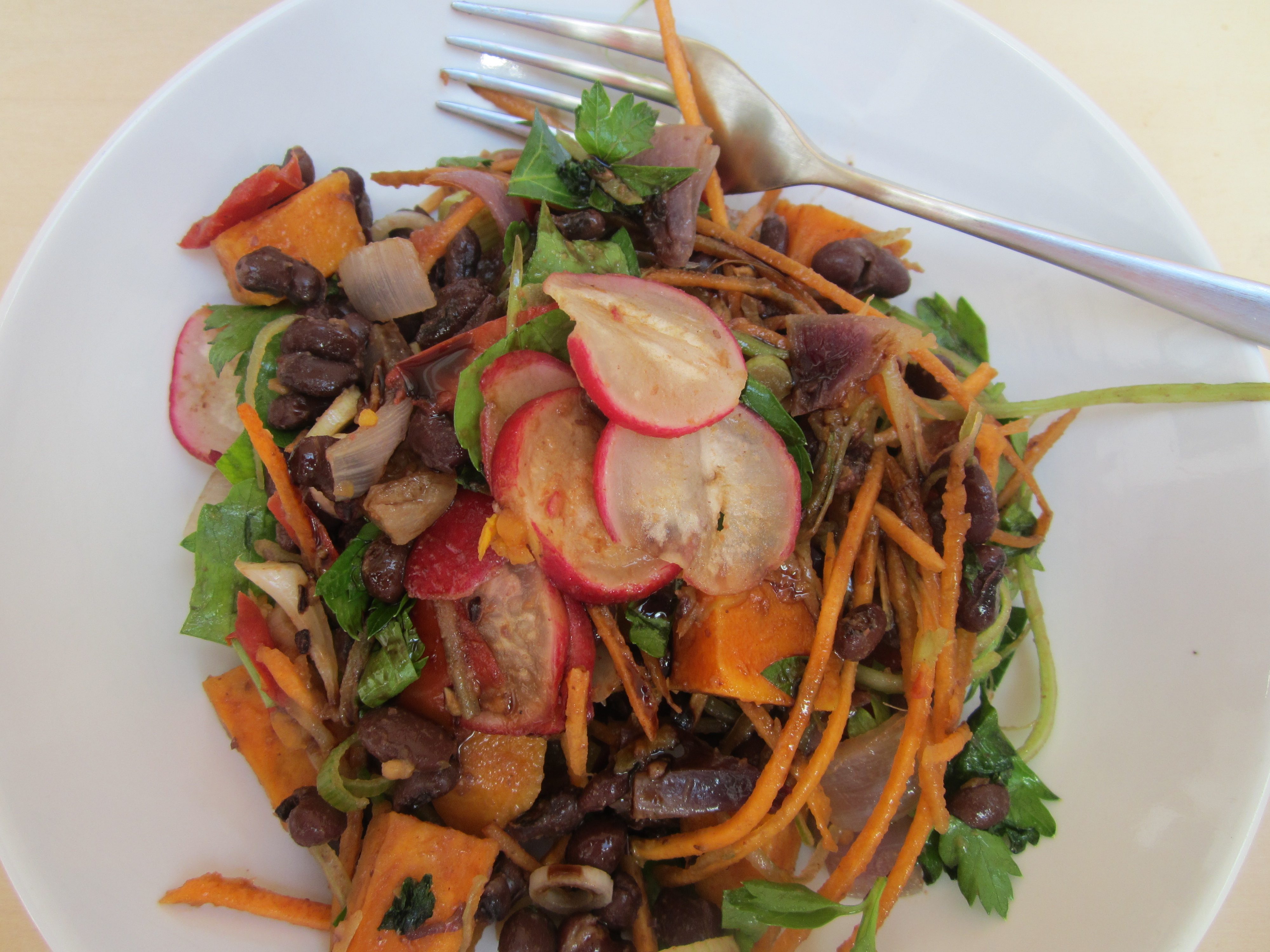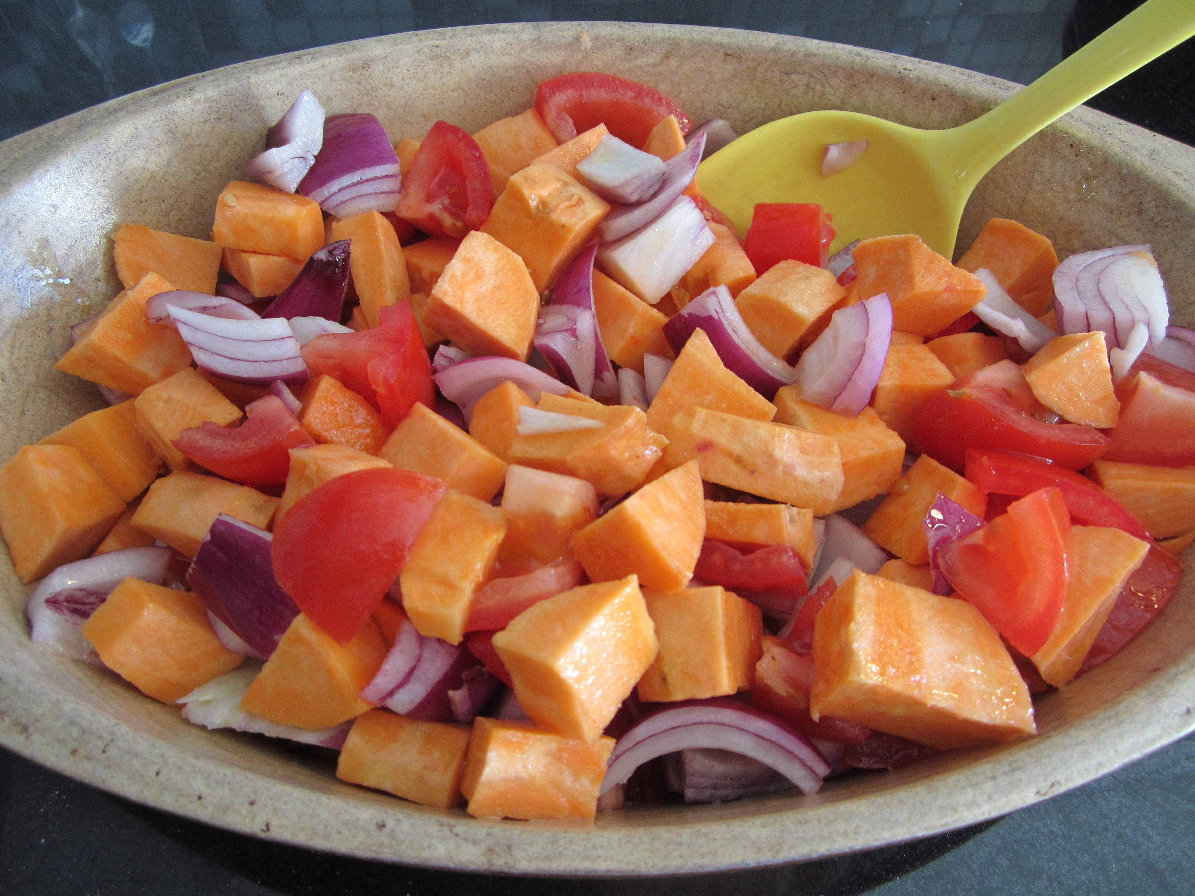Nok en solskinnsfull dag, nok en gang salat til middag. Denne gangen med ovnsbakt søtpotet, plommetomat og rødløk, samt sorte bønner og diverse rå grønnsaker. Den krever litt planlegging i forbindelse med ovnsbaking, utover det er den nokså enkel.